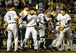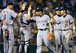 速報2007年8月5日(日) 対広島 14回戦 広島 阪神4×2広島4連勝で貯金5!!4 所載はこちらをクリック 黒田の奇襲先発なんの! トラ打線、難なく天敵攻略で4連勝!!4連勝で貯金を5とし喜ぶ阪神ナイン=広島広島戦に先発した阪神・岩田=広島 (セ・リーグ、広島2-4阪神、14回戦、広島9勝5敗、5日、広島)「来るとは思わんかった」と岡田監督。予想していなかった広島の先発は中4日の黒田。しかし、敵の奇襲戦法にたじろいだのも一瞬。阪神は三回に早々と4点を奪った。 黒田には5連敗中と相性はよくない。攻略へ弾みをつけたのは鳥谷だった。一死から左翼ポール際に飛び込む6号ソロ。外角高めのシュートをコースに逆らわず振り抜いた。「いい形で打てた。よく伸びた」と自画自賛した。 赤星が中前打で続き、シーツがバント。焦った黒田はボールが手につかず(記録は内野安打)一、二塁と好機を広げた。続く金本のゴロも、動揺した黒田が一塁に悪送球。1点を追加すると、その後も林威助の適時打など、打者10人で4点。「相手のミスにつけ込んでの攻め。シーツのバントが効いたね」と正田打撃コーチも満足そうだ。 天敵を攻略して4連勝。岡田監督の顔には自然と笑みが広がっていた。★「JFK」がそろい踏み いまや欠かせぬ勝利の調味料 4-2の七回からは「JFK」が登板。3試合ぶりのそろい踏みで、阪神が逃げ切った。七回は久保田。連打で無死一、二塁とされたが、そこからは150キロを超える速球でネジ伏せていった。無失点で切り抜け「必死でした。抑えられてよかった」と胸をナデ下ろした。ウィリアムス、藤川は3人ずつで完ぺきに抑えた。それでも藤川は「自分が出たら、絶対に大丈夫と思われるようにならないとね」と口元を引き締めた。◆シーツ(三回にバント安打)「アウトになってもチャンスのまま。狙っていたよ」◆岩田(四回途中2失点で降板)「決め球が全部甘く入った。低めに集められるようにしたい」◆久保コーチ(3勝目の杉山に)「中継ぎには中継ぎの難しさがあるから、いろいろ経験してほしい」