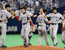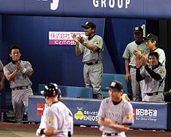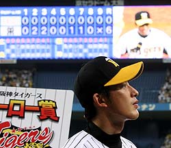 岡田さい配ズバズバ的中!オーダー&代打・葛城も完ぺき!岡田監督(中央)も拍手がやまない? 鬼さい配がズバリで今季50勝目だ (セ・リーグ、横浜6-8阪神、14回戦、阪神9勝5敗、10日、横浜)予言だけちゃう。さい配も的中や! ハマでのど突き合いのシーソーゲームに、岡田監督のタクトが冴えに冴える。思わず自画自賛の言葉もこぼれた。◇ 「上園はきょうは全然。コントロールが悪かったな。葛城が大きかったな。あそこ2点差やったからな」 情を挟むスキなんてない。5勝目の権利を持つ先発・上園だが、2回4安打、4四球2失点の荒れる内容に見切りをつけた。2点リードの三回二死一、二塁で、上園に代わって代打に葛城を告げた。すると左中間へ2点二塁打。4点差と突き放す一打をほめ上げた。 7日の巨人戦(東京D)の後は「あした打ちよるよ」と予言し、その通りに8日は22安打15打点した。「次が心配」と話していた前夜は、延長十二回ドローに終わった。そして「あした、あさっては左がくるんやろ」と締めた。 この日は右腕・秦の可能性もあり、チーム内でも情報が錯そう。しかし読み通りだった。メンバー交換を終えると、広沢打撃コーチにあえて「秦や」とジョークを飛ばしてみせた。 1番に浜中を迷わず据えた。6月5日の楽天戦(フル宮城)以来、今季2度目の抜てき。二回一死満塁では勝ち越しの2点適時打を右前へ。「ちょうどいいところで回ってきた」。オーダーまでズバリだった。 「JFK? 出さんでもいいやろう。先発が踏ん張らんと」とハッパをかけた指揮官。通路で時計をみると「きのうと同じぐらいやな」と笑みを浮かべた。将の言葉が現実に起こる今の虎に、オカルト的な勢いすら感じる。三回に送った代打の葛城が期待に応えた★葛城3戦連続安打 1点を追加して迎えた三回二死一、二塁で代打出場した葛城は、左中間を切り裂く2点適時二塁打。4月30日の広島戦(広島)以来の感触だった。「きっちり打てました。勢いを感じてたんで」。だが、ここ3試合連続安打と調子は上がってきた。「この状態でいきたい」と意気込んでいた。★上園プロ初ヒットも本業は… 何とか意地は見せた。上園が2点ビハインドの二回一死満塁で右前打。記念すべきプロ初安打を貴重な適時打で飾った。「四球も多く出して、リズムも悪くてチームに迷惑をかけてしまった。次はしっかり低めに投げられるようにしたい」。本業の投球では自身最短となる2回降板。4安打4四球で2失点…。連続無失点は11イニングでストップし反省しきりだった。トンネル失策堪忍してや~!復調シーツが汚名返上決勝打!シーツが六回に勝ち越しタイムリー。存在感を示した (セ・リーグ、横浜6-8阪神、14回戦、阪神9勝5敗、10日、横浜)決勝打は復調モードの3番・シーツが放った。同点の六回一死一塁。横浜4番手・加藤から左中間にぶっ飛ばし、好スタートを切った一走・鳥谷が快足を飛ばしてホームを踏んだ。激戦に終止符を打つ一撃。殊勲の男も試合後はグッタリだ。 「試合が長かったけどいい場面で打ててよかった。間が多くて集中しにくかったけどね」 前日9日の巨人戦(東京D)では6タコに終わった。この日の四回の守備でも、石井の放ったサードへの当たりをトンネル。名手にあるまじき失態を見せたが一打で取り戻した。 「絶対打ちたいという気持ちで打ったんだ」 前半戦は常に結果を引きずっていたが、いい意味での開き直りができるようになった。前夜は打球がことごとく相手の正面に飛ぶ不運も「それも野球だよ」とケロリ。闘争心はそのままに、神経質な一面は表に出なくなった。 相手先発の左右によって、打順を柔軟に動かし見事にハマっている。それも、懸案だった3番が固定できるようになったからこそだ。今季残り47試合、まだまだ逆襲は可能だ。JFK揃い踏みで12戦無敗!球児は再びセ界トップの30S!球児が満を持してマウンドへ。今季30セーブ目をマークした (セ・リーグ、横浜6-8阪神、14回戦、阪神9勝5敗、10日、横浜)意地と意地がぶつかりあった熱戦。「JFK」が、追いすがる横浜をねじ伏せ、2夜連続のゼロ封。最後を締めたのは、もちろん藤川だ。 「30セーブ? たいした数字じゃないですよ。でも、うれしいですけどね。チームの成績に関係するんであんまり意識はしないですけど」 29で並んでいた中日・岩瀬を突き放し、セ界単独トップに躍り出る30S。その力を遺憾なく発揮した。 まずは吉村。全4球が150キロ超の“火の玉”剛速球。最後は151キロ直球で空を切らせた。だが“魅せる”のはそこまで。「2点差でランナー出したらアカンから。吉村に真っすぐでいってたから、次の打者も考えるやろうし」。続く内川には、フォークで三ゴロ。そして、最後の相川はカーブ、フォーク、フォーク。全3球すべて変化球で空振り三振に斬った。 東京ドーム3連戦では、ファンサービスにも精を出した。エキサイトシートの子供相手に、即席のサイン会を実施。「夏休みやからね。一応は」。ファンを思い、大事にする。子供たちへ、勝利もプレゼント