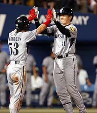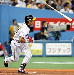 林、猛暑払い特大14号ダ~ン!トラ奪首ロードまっしぐら!四回、中押しの3ランを放った林(右)が、出迎えた赤星と笑顔でハイタッチ (セ・リーグ、横浜1-5阪神、16回戦、阪神10勝6敗、12日、横浜)林弾で猛虎進撃-。阪神・林威助(リン・ウェイツゥ)外野手(28)が、約1カ月ぶりとなる14号3ランで横浜を退けた。首位・巨人と3.5ゲーム差に迫り、虎の勢いは止まらない。14日から2位・中日と3連戦(京セラD)。大阪に戻って一気に2位奪取や!!◇ 忘れていた感触が、両手の中に蘇った。実に25戦、111打席ぶり。伸ばしたバネを解き放つように、打球は右翼席中段まで飛んでいった。林弾で3位死守。虎の絶好調ロードが再加速した。 「ボールは見えていました。もともとホームランは狙ってないし、ホームランも1本のヒット。気にしてなかったです」 1点リードの四回、二死二、三塁の第2打席。横浜先発・秦の139キロ内角直球が高めに浮く。絶好球にアーチストの本能が目覚めた。7月8日の中日戦(ナゴヤD)以来となる14号3ラン。眼下の敵との3連戦の勝ち越しを決める一発だ。 文字通り金本の背中を見て、その後を打つ5番打者。主力となって初めての夏、その偉大さをかみしめる。アニキが抱える左ひざ半月板損傷の痛みを、最もリアルに想像できるのが林なのだ。 「自分とは少し症状が違いますけど、同じ左ひざでした。痛かったですけど、試合に出ないとプロには行けなかった」四回に林がズドン。右越えへ約1カ月ぶりの3ランを放った 近大4年時、遊離軟骨による左ひざの痛みに苦しんだ。早い段階で虎からのラブコールは届いていたが、「休めば指名してもらえない」と思い込んで悩んだ。リーグ戦は週末ごとに最大3連戦。痛み止めの注射を打ったが、3試合目になるとズキズキと痛み出した。 本来の打撃はできなかったが、精いっぱいのアピールだった。ドラフト会議を前に、球団内では故障について議論されたが、ビデオを見た当時の田淵チーフ打撃コーチ(現日本代表ヘッド兼打撃コーチ)が「必ずモノになる」と断言。プロの道が開けた。 ただし金本は毎試合、しかもフルイニング出場を続けている。その重みを知るからこそ、オレも続くと決意は固い。4月下旬に定位置を奪い、間もなく4カ月。「全身ボロボロ」とは言うが、前を打つ男に必死にくらいついてここまで来た。 「きのう、どっちにいくか分からん展開で負けて、きょうの勝ちは大きい。地元に帰るし」。取るべき試合を落とさない。若き大砲が打った試合は7連勝。岡田監督は満足だった。首位の巨人とは再び3.5差。仰げば頂点が見えている。 14日から京セラD6連戦(中日、広島)。まずは落合竜と3番勝負で2位の座をうかがう。これで7カード連続負け越しなし。長期ロード6勝2敗1分け。混セの中心で虎が吠えている。★岡田監督、魔法のセリフで打たせた 指揮官の“ゲキ”が打たせた一発!? 試合前フリー打撃を終えた林は、岡田監督から声を掛けられていたという。 「ホームラン打つのやめたんか? ホームラン打っていいんやで」 打っていいと言われて打てるものではないが、この一言でリラックスできたようだ。林弾が飛び出せば7連勝。そんな心強いデータを知っての言葉だったのか…。「本当に打てたけど、監督の反応を見る余裕はなかったです」と林。虎将はすこぶる上機嫌だった。◆林の久々の本塁打について阪神・広沢打撃コーチ「リンちゃんらしいガツンという当たりだったね。打率.310くらいで悩めるのは、幸せだよね」二軍暮らしの努力実った!不死鳥・能見127日ぶり2勝目!先発した能見が4月7日以来の2勝目 (セ・リーグ、横浜1-5阪神、16回戦、阪神10勝6敗、12日、横浜)やっと晴れ舞台に戻ってきた。表情は崩さずとも、苦労を重ねた分だけの熱い感情が込み上げていた。ヒーローだけに許されたインタビュー。大観衆の前で、能見が思いっきり叫んだ。 「僕の名前を忘れていたと思いますけど、これからもっとチームに貢献できるように頑張ります!!」 2カ月以上にも及んだ二軍暮らしの努力が実った。ハイライトは3点リードの六回。一死から金城に右前打を許し、4番・村田を迎えた。流れを左右しかねない危機。それでも冷静だった。カウント2-1から3球続けてチェンジアップを連投。「抜け方が良かった」。昨オフに身につけた自慢の球種で遊ゴロ併殺に仕留めた。堂々の内容で6回5安打1失点。4月7日の巨人戦(東京ドーム)以来、実に127日ぶりの白星。復活の2勝目(3敗)を、プロ初勝利を挙げた横浜スタジアムで飾ることができた。最後を締めた球児を出迎えた能見 「自分がいなくなってからチームの状態が上がった。チームが悪いときにいて、良いときには自分がいない。辛かった」 開幕ローテに名を連ねながら、いつの間にかファームが主戦場。それでも高い意識を保ち続けていた。「開幕のころと同じことをしてたら、同じ失敗をする。新しいことを試さないと」。打者のタイミングをずらすために、数種類のクイック投法の練習に時間を割いた。新球・ツー