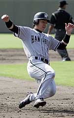 日本シリーズ仕様の足回りやで!! 阪神・鳥谷敬内野手(24)が13日、秋季教育リーグのフェニックスリーグのインボイス戦(サンマリン)に『2番・遊撃』で先発出場。七回に左中間への打球で積極果敢な走塁を披露して、適時三塁打とした。ロッテヘと傾いた日本シリーズ(22日開幕)の対戦相手。機動力のある相手を、赤星だけでなく、鳥谷も足で威嚇する。