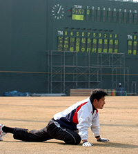 えっ、ジャパンVs阪神!? 完成したスコアボードを背にトレーニングする能見