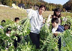 ちびっ子ファンと共に大根を抜く桧山。代打本塁打の記録よりも先発にこだわる