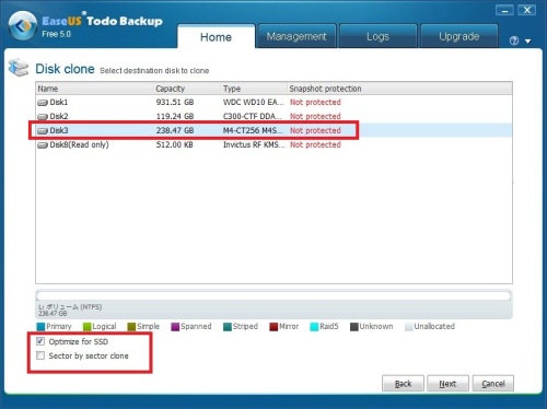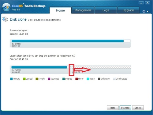 Sector by sector clone :セクタ単位でコピー これにチェックを入れると、次の画面でパーティションの領域を変更出来ないようです