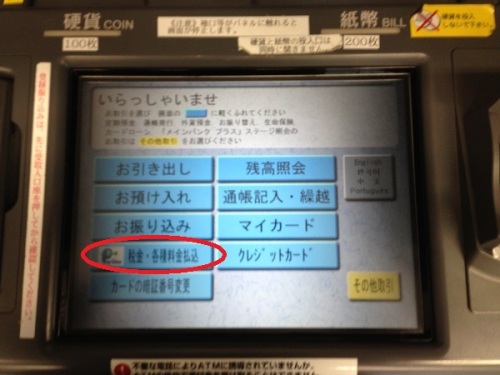 5.ATMのペイジー(税金等の支払)ボタンから、先ほど控えた番号を入力して支払いを完了します。