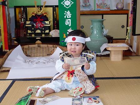 一歳になります日曜日に餅ふみやりました。お餅踏んだ後に、いろんな道具を並べてどれを取るか??ってそれで将来を占う?らしいヒロシは、まず『そろばん』それからだんな様の『医療関係の本』その後は『お金』お金はしっかり持って離さなかったんで、パチリ♪きっとヒロシは『医は算術なり』ということで金儲けに走る医者になるだろう・・・( ̄∀ ̄*)と言うのが推測されます・・・( ̄m ̄〃)いろいろあった一年前・・・早いな~~私も、来月からパートで期間限定だけど働くし(〃 ̄_ ̄)専業主婦。もっと満喫したかった~~~~ぁ道具だけ揃えて完成したものは、この一年でいくつある??ひょっとして、チビのスモックとヒロシのズボンだけ?でも、今年は頑張らねば!!幼稚園のバザー委員にもなっちゃったし、手作り必ず出品しなきゃいけないし。。。というわけで、ただいまだんなにロックミシン交渉中( ̄m ̄*)使うのか??という声が聞こえてきそうだけど・・・安~~~いヤツからチャレンジしてみようかと思ってます乞うご期待!!