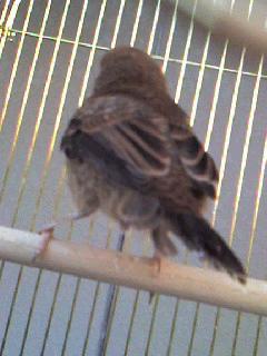 夕暮れ、ご機嫌よくブランコに乗っていたもずきち。その時、ふいに猫が鳥カゴを襲った!バタバタバタと羽音がして見てみると、鳥カゴが無惨にもひっくり返されている。もずきち だいじょうぶか 駆け寄って鳥カゴを起こす。もずきち、なんとか無事。鳥カゴを家の中に非難させる。もずきち、ショック大。 しばらくしたら、立ち直っていつものようにふっくらふくらんだ。フゥ・・・ 明日からは徹底的にもずきちを守ってやらなければ・・・。巣立ちまでのあと数日、頑張るよ。私も。