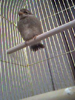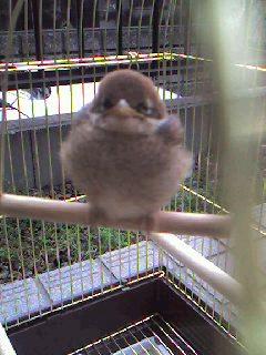 昨日の晩は暗い部屋に鳥カゴを入れたので、もずきちはふっくらふくらんで止まり木の上で眠っていた。明け方から雨になり朝はずっと降っていたけど、もずきちはとっても元気にブランコに乗っている。外に鳥カゴを出せないなぁ・・って思っていると、親鳥の泣き声が聞こえてくる。昨日はキチキチキチと強く鳴いていたけど、今日は少し穏やかだ。しばらくすると、雨の中、何かをくわえて電線に止まっている親鳥のオスがの姿が見えた。すると、もずきちがけたたましく鳴き出した。雨のかからない軒下に出してやると、もずきちのパパが勢いよく飛んできて鳥カゴにしがみつきながら、くわえていたハエを必死に与えようとした。もずきちもパパのほうに擦り寄っていった・・・が、ハエが気に入らないと言わんばかりに、もずきちはそれをポイっと捨てた。・・・もずきちのパパは、鳥など一羽も飛んでいない雨空に向かって再び飛んでいった。鳥カゴの底で死んだハエが一匹転がっている。もずきちのパパが帰ってきた。今度は青虫のちぎったようなものをくわえている。もずきちはチチチと元気よく鳴いて催促している。どうもこれはおいしかったようだ。 もずきち・・わがままにもほどがある。私はそっと窓越しに観察している。お昼を過ぎて雨がようやく上ってきた。外に出ると、電線に百舌のオスとメスが止まっていて鳥カゴを見ている。用事で少しの間外出して帰って来ると、親鳥の姿はなく、もずきちはブランコに乗っている。鳥カゴの底には、もうひとつケラ(おけら)が落ちていた。もずきちのパパもママももうちょっと考えたほうがいいと思う・・3cmは大きすぎる。今、もずきちは鳥カゴの中で穏やかにふっくらふくらんでブランコに乗っています。あと何日で巣立ってくれるのでしょう。