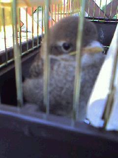 鳥カゴを軒下に吊るす。 こんな簡単なことが何で思いつかなかったんだろう。|||(-_-;)|||早朝から親鳥が鳴いている。午前中、パパ鳥はもう10往復もエサを運んでいる。生きている蜂を運んできたが、半死状態で鳥カゴの底に落ちている。(だから・・かたいのと、羽のついてるやつはキライなんだって・・もずきちは。)とにかく青虫が大好きで喜んで食べているが、カゴ越しだから親鳥からもらうタイミングが合わず落としてしまった青虫がいる。まだ動いている。うちの主人がやって来て、ピンセットで食べさせている。もう、大丈夫だね。飛べる日が来るまで、もずきちのことは親鳥と主人に任せようっと。空に放す前に、飛ぶ練習を家の中でさせるとかなんとか言ってますが・・・。私は、もうここらへんで趣味の映画鑑賞にもどります。巣立ちの日、またレポートします。