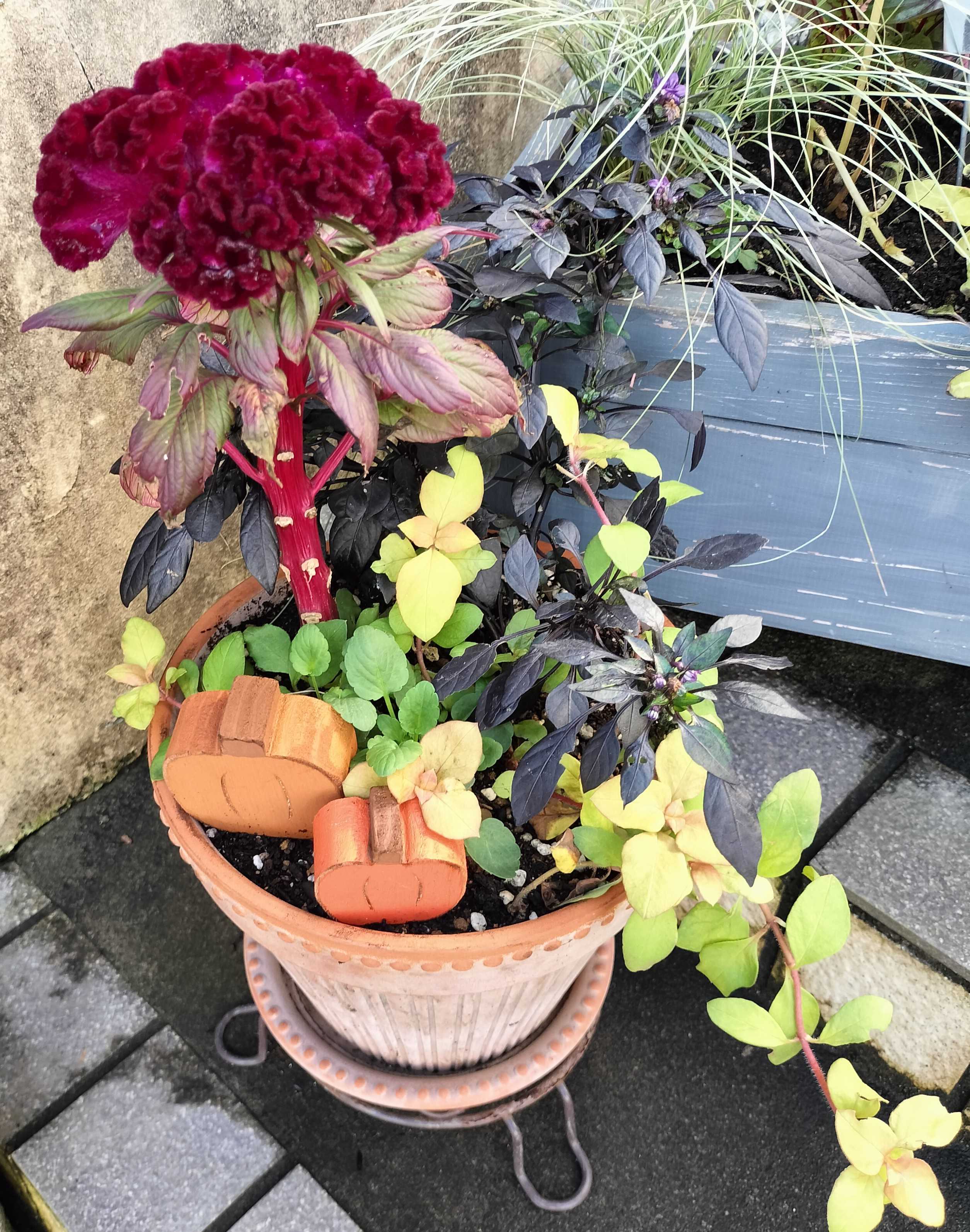 今シーズン2回目のビオパン購入です モミジの紅葉が素晴らしい「葉凪」さんで 見つけました この美しい景色の中 苗や雑貨選びが出来るのは最高です 今回選んだのは ゲブラナガトヨ「魅黒」 「黒すずめ」をコンパクトに 選抜改良した品種だそうです ハンギングやリースに使いたいという 声にこたえた品種のようですが まずはおひとり様植えにしました もう一品種の購入は「万葉菫」 画像で見たときは あまり惹かれなかったですが 実物を見たら 何とも言えない花色に 思わず手に取ってしまいました 桂楓園オリジナルの和風色のビオラです【最新品種】 桂楓園さんビオラ 万葉菫 「おぼろ月」3.5寸ポット苗 花苗 寄せ植え リース 花壇 パンジー コチラもおひとり様植えにしました ただクローバーを少しだけ 植え込んでいます 植え込んだクローバーは エンジェルクローバー・オニキス花苗 エンジェルクローバー オニキス 9cmポット 1苗 農林水産省品種登録登録品種名:天使のピアス オニキス 品種登録番号:第21538号 購入苗を株分けして使用しています このノームオブジェの雑貨も購入【コベントガーデン】ノームオブジェ L (pr-06)【置物 小人 ドワーフ ノーム オブジェ ガーデン雑貨 ガーデニング シャビー デコレーション ガーデンオブジェ かわいい 】【インボイス対応】 大小のノームオブジェがありました 大小二つあるとよい感じになりそうですが 小さめの一つでがまん 飾り棚に並べました 前回購入していたアイクルールと合わせて 3つのビオパンが並びました 今シーズンのビオパン選びは 少し渋めの花色になりました