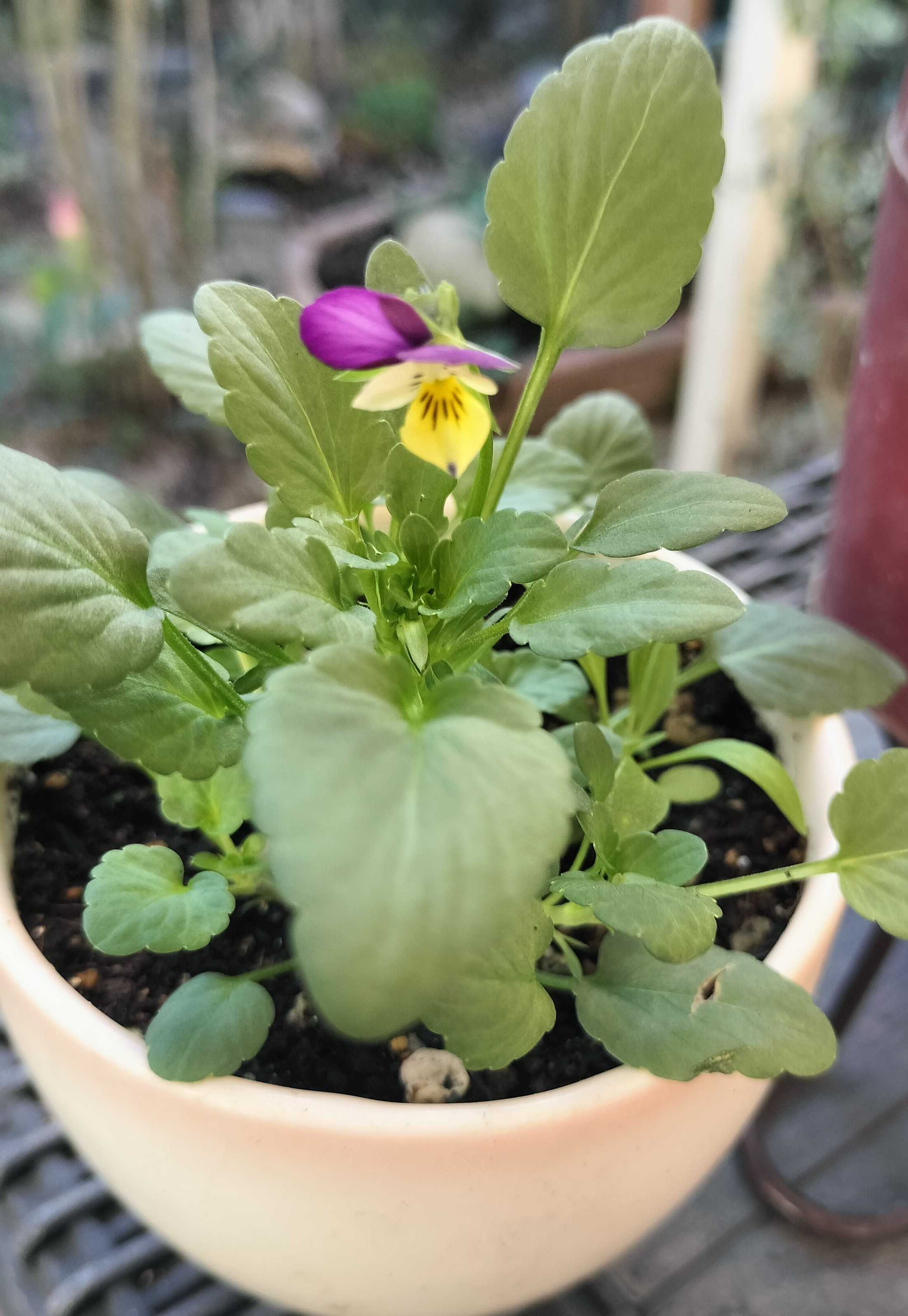 種まきっ子ビオラが開花しました まだ完全には開ききっていません 直径1センチ位の極小輪ビオラです 2023年の開花1号は11月21日 2024年は11月18日 今年2025年は11月3日 タネを蒔いたのは遅かったですが 開花は早いようです 11月に入ったので開花が続くようにと 急ピッチで種まきっこ苗を植えこんでいます 今年の種まきっこビオラは 発芽したものがほぼ100パーセント 育っているのではないかと思います 無理をして早撒きをしなかったことと 9月後半になり 気温が昨年より早めに下がってくれたことが 関係あると思います 気候次第で育つ苗の量が大きく違います 今年はビオラもストックも たくさんの苗が育ち 植え場所に悩むといううれしい悲鳴です 昨年と同じようにミニ鉢に 種まきっ子ビオラ3苗 アリッサム クローバーを植え込みました 同じミニ鉢にやはりビオラ3苗 アリッサム そして黒竜を植え込みました 飾り台の上にふた鉢とも置きました 2025年3月20日画像 昨年は10月下旬に同じミニ鉢に植えこんで 3月後半にやっと満開状態でした ただ花を見られるのは遅くても 日に日に変わる成長過程を見る楽しさが あります 開花までゆっくり楽しみたいと思います アイアンのバッグ型の鉢にも ビオラ アリッサム ワイヤープランツを 植え込みました 2025年3月18日画像 この時はネモフィラプラチナスカイを 一緒に植えこんでいました アイアンバッグに植えこんだビオラの開花も やはり3月中旬 種まきっこビオラは11月ごろから ぽつりぽつりと咲きだしますが 満開になるのは3月になってからです コチラは飾り台の上に飾るか 別の場所に置くか考え中 吊り鉢にはビオラ3苗を2セット そしてアリッサム ワイヤープランツを 植え込んでいます この吊り鉢はコハウチワカエデの木に かけました ひと回り小さな吊り鉢には ビオラ3苗 アリッサム ヘデラを 植え込みました コチラの吊り鉢は アーチに吊り下げました そして今回はじめて ビオラを立ち上げ花壇に地植えにしました 年内は種まきっ子ビオラを 鉢やプランターに植えることが多かったです 今年は鉢などに植えるだけでは足りず 地植えもしていこうとしています ひと足早く植え込みをしていたものは 今このくらいです つぼみはまだ見えていません 周りに植えたイオノプシジウムの生育が よいです 今週から朝晩の気温がぐっと 下がってきそうです ビオラの生育は気温が下がると ゆっくりになるでしょう それでも今月中には 開花ラッシュが始まってくれると 期待しています