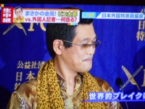 昼寝から目覚めてを点けるのは癖飛び込んできた画像が(これが噂の“ピコ太郎!?)場所は東京・有楽町の日本外国特派員協会(世界中のレコード会社との契約と、ビルボードランキングの最短曲(45秒)登録でギネス世界記録に認定されたことが発表された。)試しに「ユーチューブ」で引っ張ってきてみた外人!いや日本人も、こんなん好きかも。何年か前「カンナムスタイル」流行ったね。
