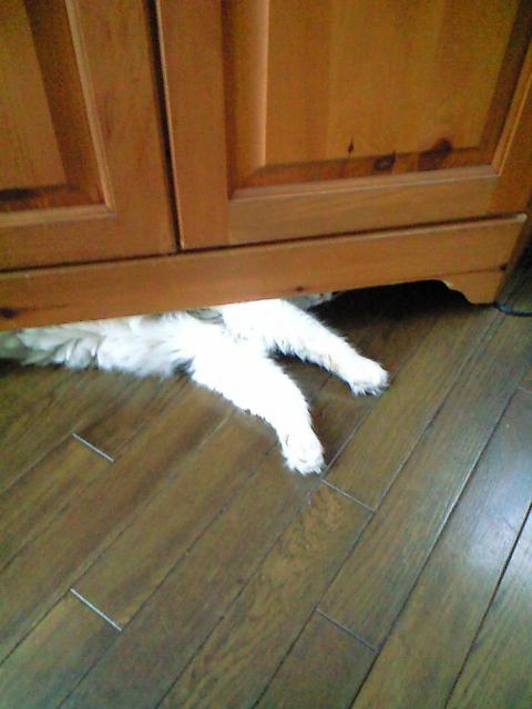 さてー・・・・。今日も暑い戸棚の下に誰かもぐっています。この手はだあーれだ覗いてみましょアッ、このピンクの鼻は・・・・レオぽんですねレオくんは、いつもこうやって、ホコリのつきそうな所に入り込みます。そのせいか、イヤ違うと思うけど。。。レオくんは何だか猫ズ家族中で、一番薄汚れています。。。白いはずのお手手の毛もなんか、黄色っぽいというか、茶色っぽいというか、チタナーイ、感じ。ここで、ムサシくんと、手のひら比べまず、レオくんの手。そして、ムサシくんの手。ワリトきれいでしょ???ねえ、レオくんって、汚れがつきやすいタイプなのかしら・・・・。ブログの人気投票!お願い!押してね。人気投票ですニャン!二ヶ所ポチっとお願いいたしまする。。。