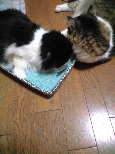 今日は猫ズにお土産があります新しい爪とぎです。早速ルカちゃんが、駆け寄って来ました。身体は小さくても、母は強し一番手ですニャン!爪とぎの上にドーンと全身乗っかって動きません・・・・。レオくんが、”お母さん、ボクにもかして。。。。”と、言っていますが、手は出せません。。。怖いンです。。。弱虫だから。。。。ムサシくんも来ました。ジーと、見てますが、まだルカちゃんはどいてくれません。が、その後に、猫ズ達は順番におニューの爪とぎで、盛り上がりましたそして、ナゼか、15分後には、もうボロボロで、中身が外に出ています。そんでもって、どういうわけか、爪とぎの箱の中に、、、、ムサシくんが入っていました、と、さ。ブログの人気投票!お願い!押してね。↑二ヶ所ポッチとお願いしまーす。