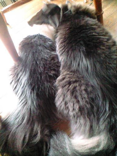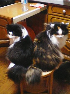 台所で、おやつをねだるルカちゃんと、セリちゃんです。小さな椅子の二匹で分け合って座っています。カワイイ姿でしょ???この気温なのに、毛がもしゃもしゃ長くて・・・。暑そうですね。おしりが二つ並んでます。ブログの人気投票!お願い!押してね。↑二ヶ所ポチッとお願いします!