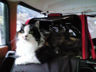 さあ、遅い夏休みに突入!です。みんないっしょに、高原に行きます・・・・!て、ことで更新がままならない状態です。でも、しっかり、ボケボケ旅日記は後日お送りしますよみんな一緒ってことは、そうです。猫ズも一緒で、ペット可のコテージに泊まります。まず。行きがけの車の中の珍道中・・・・・。猫ズは、ありがたいことに車が平気!キャリーは二段がさね二階にはせりちゃん。車窓を楽しんでいますにゃん。下の段はムサシくん。(上から見えてるのはせりちゃんの手)そのうちに、こうなりましたルカちゃんはずーと膝の上です。車の中は第二のリビングと、可したのでした・・・。まだまだ、あるぞ夏休み珍道中ですが、ネット状況の悪さゆえ、、、、詳しくはまた。。。では。にゃん。