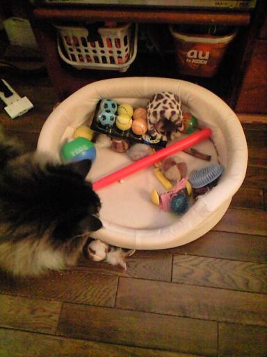 コレは、もと猫ちゃんのベッド・・・。ですが、ウチの猫ズ達には小さくなってしまったのです。で、今はオモチャ入れになっていますが・・・・。今日は、丿ソーっと、近づいて来たムサシくん。ジッと見て。。。。次の瞬間、こうなっていましたまあ、すっぽりと、ムサシくんの巨体に中身は隠れてしまいましたが・・・・。もう一度、お見せいたしますが、ベットの中には、こーんなに、ごちゃごちゃオモチャが入っているんです。デコボコ、ごろごろ・・・・。寝心地いいかームサシくんもしかして・・・・・・。気がついて無い感じてないんーーー。やっぱり・・・・。ムサシくんって。。。。イヤ、何でも有りません。ブログの人気投票!お願い!押してね。↑人気投票でーす。二ヶ所ポチっとよろしくお願いします!