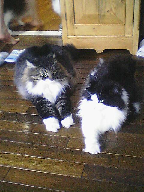 一昨日から、体調を崩したレオくん。獣医さんに連れていって、点滴注射してもらいました。脱水症状が出てたもので。。。。そうしたら、ホントにウソみたいに元気になりました。食べると吐いていたんで、一日は絶食!を言い渡されたんですが、本人は、食べたいでも、お茶碗のご飯、片づけちゃいましたレオぽんは、お茶碗のそばに陣取って待ってます。けど。そんでもって、おバカなムサシくん。レオポンが獣医さんから、怖い思いをしてかえってきたのに、まるで解って無いレオ ”ムサシー、怖かったニャン。チクッて血もとられたニャーン。スリスリしてニャン。。”ムサシ”ん?レオ?いなかったのニャン?ちっとも、気がつかなかったニャン。寝てましたにゃん。”レオ ”痛かったニャン。一緒に、ネンネしてよう”ムサシ ”なんか、へんな匂いするぞ、お前、ナなんだニャン。あの怖いところの匂いニャン。 注射の匂いだ!にゃん。” ’敵だ、敵だ、近寄るなー” ”あっちイケニャン。ヒャーだ。”んーん。ホントにおバカ。可愛そうなレオくんでした。ブログの人気投票!お願い!押してね。↑二ヶ所ポチっとお願いします!
