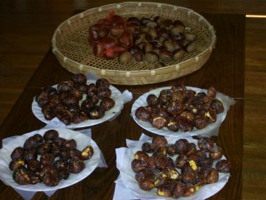栗をいただきました。大きくてツヤツヤとしてりっぱな栗です。5キロくらいありました。簡単に食べきれそうにないので、包丁で甘皮を外し、レンジでチンをしてしてから油で揚げてみました。かるく塩を振りまして、姉、娘、友達に届けましたところ「うん・・・まあまあ」とか「面白い味」という感想でしたが、結局「おしかった」とか・・何とか・・・食べる前にレンジでチンをしたほうがよかったかと・・・