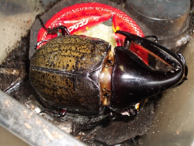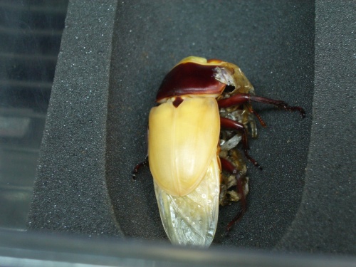 毎日仕事から帰宅したら、部屋に行く前に飼育部屋の確認を行います。本日も同様に飼育部屋の確認を行いました。すると、飼育部屋の奥の虫のいないところから変な音が聞こえてきます。ガリガリと。音のする方向を確認すると、以前温室を作成したときのスタイロフォームの切れ端がおいてあります。そのスタイロフォームの切れ端に、でっかい大きな塊がしがみついてスタイロフォームを削っていました。そうです、旅行中に行方不明になったヘラヘラです。無事に確保できました!☆になっていなくて良かったです。本日、帰宅が遅かったのでこれ以上のネタはないのですが、オオクワの♂蛹を露天掘りしました。あと、2~3日で羽化しそうです。すでに露天掘りにしたアンタエウスミツノ♀、人工蛹室のコーカサスの♂も近いうちに羽化してきそうな感じでした。特にコーカサスは早めに羽化してきそうです。