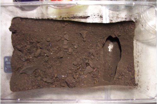 仕事の帰りにいつも使っている地下鉄が人身事故で止まっていました。とほほ。振替輸送で違うルートで帰宅したため通常1時間の通勤時間が倍の2時間かかってしまいました。相変らず運の悪い状態が続いています。本日のカブクワ弄りですが、行方不明のヘラヘラの捜索です。おびき寄せ作戦は失敗に終わってしまったため、飼育部屋奥の釣り具や空き箱あたりを確認しました。ヘラヘラがいればガサゴソ音がすると思うのですが一切聞こえてこず、釣り具や空き箱をどかしての確認でも見つかりませんでした。どこに行ってしまったんだろう....☆になっていなければいいのですが...次に行きます。基本的にウチではヘラヘラの♂はプラケース大の単独飼育です。そのうちの一つのケースで数週間前に羽化を確認していたものがあります。ただ、このケースでは、ケースの短辺方向に蛹室を作っていたため、角曲がりを覚悟しており掘出しのテンションも上がっていませんでした。本日意を決して掘出しです。まずは、見事に短辺方向に作られた蛹室です。短辺の端から端までを使った蛹室でした。ここに入っていた成虫は...角曲がりがなくほっとしました。運が良くなっている兆し?