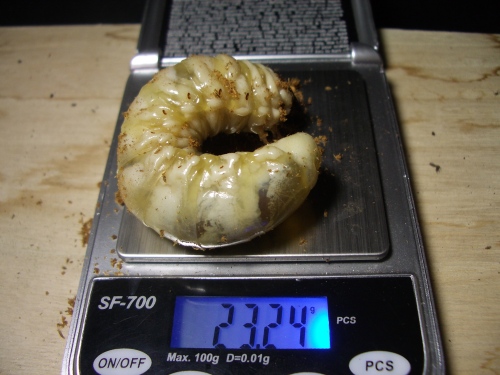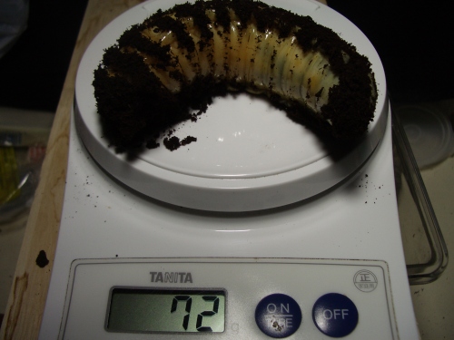 またしても放置ネタです。クワ編ということで、国産オオクワ阿古谷産の♂ニョロです。ExceedCraftさんの800cc菌糸ビンに10/27に投入して放置していました。菌糸部分は食い切っており、パウダー状になっていました。同じような状態のものが2本あったのですが、片方は蛹化しておりもう一方はニョロのままでした。そこそこ大きくなっています。タイミングよく菌糸交換していればもう少し大きくなったのでは?と反省しております。蛹のほうのボトルも写真を撮ったのですがPPボトル越しでよく写っていなかったので写真のアップはやめておきます。蛹室の位置が悪いので近いうちに掘出して人工蛹室に移そうと思います。