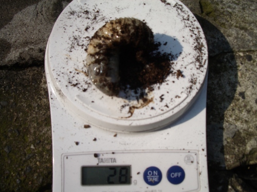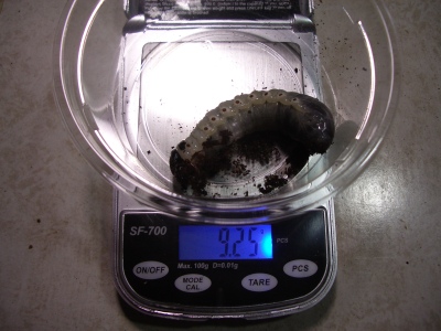 この前の土日は家族サービスでほとんどカブクワ弄りができませんでしたが今日は、カミサンと息子から1日中のカブクワ弄りの許可がでましたので、溜まっていた使用済みケース等の洗浄を行いました。冬と違って気持ちのよい陽気でしたので洗浄も辛くありません。洗浄は午前中いっぱいかかりました。その後、スリナムの1st採卵分のニョロを430ccPカップから2Lブロー容器に移し変えました。その際に雌雄判別をしようと試みたのですが、よくわかりませんでした。ニョロの大きさもほとんど同じでそこでも区別できません。全部♀や♂に偏ってたりして他にもD.H.H.の2齢ニョロの移し変えやゼリー交換などを行いました。最後に、先日、蛹化を確認したニジイロですが、どうしても蛹がみたいのと雌雄判断をしたかったので露天掘りしちゃいました。♀でしたね。人工蛹室恐怖症につき、このままで行きます