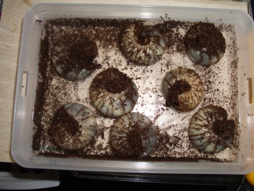17(土)の日記です。うちの廃マット処理組の国カブですが、早期羽化組みがことごとく羽化不全になっています。原因は過密飼育による蛹室破壊とミミズの大量発生による蛹室破壊のようでした。そこで本日、未羽化組みの救出作戦を行いました。羽化不全が多発している衣装ケースは、すでに手遅れで全て羽化しており羽化不全の度合いの大小はあってもほとんどが羽化不全ですorz。猛反省。別のケースでは、1頭も羽化しておらず全頭蛹になっていました。すべての蛹を人工蛹室に移しました。そのうちの一部です。なんとか無事に羽化して欲しいです。さすがに羽化不全個体は、息子の友達や近所の子供に配れませんからね。