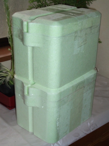 5/10(土)の日記です。本日、午前中に2つ、14時~16時の間に1つの荷物が到着予定でした。午前中到着予定でしたので息子のサッカーの付き添いをカミサンに頼み、自宅で待っていましたが全然来ません。息子のサッカー終了時間は、12:30。迎えに行く約束していたのですが....結局荷物が到着したのは、12:50過ぎ。お迎えに30分以上遅刻しました。最後にプチ試合をやっていたみたいでほとんど待ちはしなかったみたいですが。2つのうち1つは生体ですが全然問題ありませんでした)(増種じゃないですよ!)14時~16時の到着予定のものは、15:00前に到着しました。これは、アフロさんのプレ企画で当選したテルサンデールです!プレゼントはニョロということでしたが、ニョロ以外に...♂蛹もいました!1.4Lのブロー容器に入っていたのですが、配送の影響かマットの上から7割程度がぐちゃぐちゃで♂蛹の蛹室もはっきりしていない状態でしたので救出して人工蛹室に移動です。元気よくクネクネしていますので大丈夫でしょう。あと、ブロー容器の底に前蛹状態のニョロ達が見えます。このニョロたちが蛹化したら掘出してみようと思います。アフロさん、ヤッくんさん、今回はありがとうございました。頑張って成虫にして、累代しますね!
