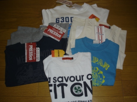 ほんと久しぶりの日記です。そして久々購入の福袋・・・絵文字にアニメーションが出来てから初めての日記だぁ~この前、ヘイヘイマミーさんの福袋を購入しました。☆ヘイヘイお楽しみ福袋☆ではさっそく全体画像【DONKEY JOJJY】トレーナー 1,900円半袖Tシャツ 1,575円【PRESS】紺 長T 3,045円グレー ワッフル長T 3,045円【KRIFF MAYER】半袖Tシャツ 3,045円タンク 3,045円計 15,655円【DONKEY JOJJY】【PRESS】【KRIFF MAYER】ドンキートレーナーの後ろとクリフタンクの後ろです。値段的にはとってもお得だと思うけどすべてトップスってどうなのかなぁ~サイズは120頼んだからボトムスが入っていてもまだまだ履けないから良かったような気もするけど・・・1枚ぐらいボトムスあってもいいよね・・あと、狙っていたFOはまったく入っていませんでした・・デザイン的には嫌いではないデザインなのでまぁいいか。という感じです。う~ん。福袋的には70点ぐらい??良くもなく悪くもなくって感じかなぁ~・・実は内緒で買った福袋だったから平日(月~金)の午前中指定でお願いしたのね。木曜日に振込をしたから土日に届いたら大変だと思ってわざわざメールしたのにそれにも関わらず間違えて土曜日の午前中指定で送ってこられちゃって・・もう怒りプンプンです土曜日はたまたま出掛けてていなかったんだけど、夜帰ったら不在票が入っててあわてて隠したの。明日電話しよう。とか思ってたら日曜日の朝ヤマトさんが来ちゃって・・たまたま玄関のそばにいたからすぐに出て受け取って隠したけどさぁ・・もう・・・そういうミスだけはやめてもらいたいよね!!・・まぁ私も隠れて買うのはいけないかなぁ~とか思うんだけど。でも今回は自分のお金で買ったんだけどね。子供服&福袋の誘惑にはなかなか勝てませんわ。