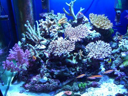 皆さんのリクエストにお応えして、右もお見せいたします^^ヾと、前の日記にてお見せしました左側、早くもレイアウト変更余儀なくされました( ̄□ ̄∥その理由は、以前紹介しましたバケモノシッタカ。こやつは、しばしばレイアウト崩してきましたが、とうとうサンゴまで落とすほどのPOWERを手にしたみたいです左側写真を掲載した次の日、帰宅して水槽を見てみると写真右上のミドリイシがひっくり返ってました【前回の写真】コイツが犯人そして、こんな風になりました^^;さあ、いよいよ右側の未練の山ですではどうぞ!なんかいっぱいあるようにみえるのは、ほとんどが白化寸前でポッキンしたものです。あとは、コケに覆われ始めているハナヤサイ、ミドリイシにLRと巻きの中で成長したコケに覆われ汚いコモン。しかもチヂミトサカまで倒れてるは、縮んでるはで・・・(´△`;)まさしく未練の山。それか問題のあるサンゴの収容山というか・・・(`∀´;)どうしてくれようあまりにも恥ずかしいので上からのアングルに代えさせてください。あっ、余計に恥ずかしかったそして最後に全景を