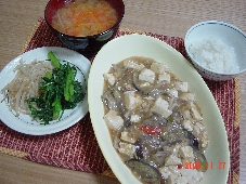 クラス会のあと、いそいで帰ったのですが材料の仕入れなどしてたらそれはそれは遅くなってました。娘とパパは私の帰りを待たずに外食に出る寸前。大急ぎで晩御飯作り。今日は朝なにも準備して出なかったので“20分で晩御飯”に挑戦です。30分かかってしまいましたが・・・。メニューマーボ-豆腐モヤシと春菊のナムルニンジンと玉ねぎの味噌汁ご飯あーーーーーーマーボ-豆腐にお肉入れるの忘れてた!!!!???でもあっさりおいしかった。思わず精進料理みたいになってました。1、ニンニク 2、生姜 3、トウバンジャン 4、葱 5、茄子 6、春雨 7、木綿豆腐 9、パプリカ 10、味噌 11、モヤシ 12、春菊 13、ごま油 14、ニンジン 15、玉ねぎ 16、ご飯