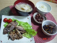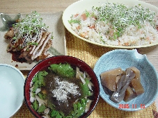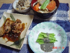 結局、今日はパパの病気に1日付き合って終わってしまいました。どうやらこの前の外食で鳥のささみの刺身を食べたのが原因ではないかとのこと・・・。大食漢なのに結構腸が弱いらしいです。ですが、冷蔵庫にはとりもも肉が、順番を待ってましたので、鳥料理です。どっちにしろパパはおかゆだし。 メニューとりもも焼き ねぎ、韮ソース具沢山味噌汁アスパラの胡麻味噌だれヒジキのたきこみご飯(先日の冷凍)1、とりもも 2、生姜 3、ニンニク 4、葱 5、にら 6、ニンジン 7、大根 8、里芋 9、しいたけ 10、油揚げ 11、みそ 12、アスパラ 13、黒胡麻 14、西京味噌 15、ヒジキ 16、高野豆腐 17~21、五穀 22、じゃこ<レシピ>アスパラの胡麻だれ アスパラは茹でるか、電子レンジでチンしておく。西京味噌(お好みの味噌)とすり黒胡麻と出し汁 を1:1:1でよく混ぜ少し醤油で味を整える。普通の味噌で作る場合は味醂か砂糖で少し甘味を加えた方がおいしいです。