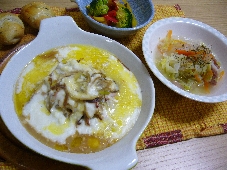 今日は牡蠣のグラタンにしました。じ・つ・は私は牡蠣など貝類が苦手。ホタテ以外は食べたいとも思わない人です。パパは牡蠣フライが好きらしいのですが、結婚してから食卓に上ったのは2回くらい。でもmebhiさんの牡蠣のデュクセルは気になってました。ちょうど昨日のスーパーでよさげな牡蠣を見つけたので試すことに。ただ今日は1日お客さんで忙しかったので、1個づつのフライは面倒なのと脂っこさが気になるのでグラタンにしました。玉ねぎ、なが葱 ベーコンをいためたものに牡蠣の煮汁で煮詰めたものを、牡蠣の煮汁入りのホワイトソースをかけチーズをかけ焼きました。が、ピザ用のチーズがない!! 仕方がないので少し油分の強いクリーム系のチーズを使う事にしました。で写真にはバターのような黄色が見えてるわけです。味はやっぱりピザ用に向いたチーズで作るんだったなぁ。と言うのが感想。そして牡蠣初体験の娘は駄目でした。きっとかりっとしたフライにしてたら食べただろうなぁ・・。メニュー牡蠣のグラタンブロッコリーとパプリカのバーニャカウダ風炒めお野菜一杯のスープヒジキとじゃこのパン1、牡蠣 2、バター 3、牛乳 4、小麦粉 5、玉ねぎ 6、なが葱 7、ヒラタケ 8、ベーコン 9、チーズ 10、ブロッコリー 11、パプリカ(2色) 12、アンチョビ 13、ニンニク 14、大根 15、ニンジン 16、キャベツ 17、ソーセージ 18、ヒジキ 19、じゃこ 20、パン生地