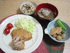 今日は友人のお誕生日のケーキに引き続き2回目の日記です。そして3回目の日記もしちゃうかもしれません。今日娘のワンピースが出来あがりそう・・。メニュー青じその豚カツ玉コンニャクの煮物きのこのお味噌汁、とろろがけヒジキのたきこみご飯1、豚肩スライス 2、青じそ 3、卵 4、パン粉 5、小麦粉 6、コンニャク 7、筍 8、絹さや 9、なめこ 10、えのき 12、しめじ 13、とろろ昆布 14、味噌 15、ヒジキ 16、ニンジン 17、じゃこ 18~22、五穀 23、プチトマト