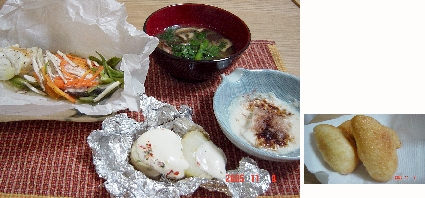 またまた本日2回目の日記です。今日はオーブンフル活動料理でした。昨日魚屋がセールで安かったので2日連続で魚ですが・・。秋ザケの切り身をオーブンペーパー(コストコ)にのせ、野菜を載せて包んでクレージーソルト(コストコ)をかけオーブンで焼きました。同時に同じオーブンでアルミホイル(コストコ)でくるんだ丸ごとジャガイモを焼いてホクホクに・・。最後にオリーブオイルやペッパーやハーブでマリネしてあるモッツァレラチーズ(コストコ)をかけて焼きました。お風呂に入ってる間に2品完成です。そして出来立てのカレーパンを我慢できなくて食べちゃいました。メニュー鮭の紙包み焼ホクホクジャガイモチーズ焼湯豆腐春菊としいたけの味噌汁カレーパン1、秋鮭 2、玉ねぎ 3、ニンジン 4、エリンギ 5、ピーマン 6、ジャガイモ 7、チーズ 8、豆腐 9、鰹節 10、春菊 11、しいたけ12、味噌 13、カレーパン