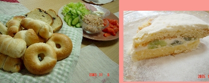 またまたベーグルランチです。皆さんで焼いたプレーンとソーセージベーグルと昨日の巨峰レーズンの食パンとコルネパンを、ツナサラダとスモークサーモンで食べました。今日はデザートはトライフル。ジェノワーズを冷凍しておいたものがあったので、キルシュの風味の効いたシロップとクリームとキウイを使って作りました。