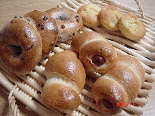 今日はソーセージベーグル、ブルーベリーが小麦粉の半分入ったブルーベリーベーグル、色は赤ワインで出してます。それからリクエストがあったのでバナナケーキ。ベーグルの話をしてたなぁと思ったらリンクのmebhiさんがすばらしいベーグルレシピを一杯のせてくだっさってたので大感激です。やっぱりプロの料理人の方の発想や手法はすばらしいですね。
