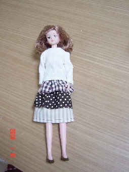 先日、トイザラスでりかちゃんの服を見ていたときから、むくむくと創作意欲が沸いてました。ためこんであるハギレが使えるではないか!!とそして第一作作っちゃいました。ここの所はまってる、チョコレート色のギンガムやドット、ミルクティー色のストライプの布地でスカート。「私と娘のシャツ」のハギレでおそろいのシャツを作っちゃいました。でも、はではでしいお顔のりかちゃんには少しナチュラルすぎる??そして娘はウエディングドレスを作れと言ってます。どうしよう
