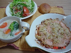 今日はまたカッパ橋へ出かけてしまいました。マトファーのシリコン型や、こまごましたものをゲット。毎度ながら楽しく興奮する場所です。幼稚園のママ仲間といったので、お迎えの時間を気にして駆け足で見て回りました。結局お昼を食べる暇もなく、強行軍でした。そのあと子供たちを遊ばせてと、晩ご飯はミルカツです。恵比寿あたりで行列の豚カツ屋の看板メニュ-だとか・・。TVでみたのを思い出して真似して見ました。メニューミルカツコーンクリームスープサラダほうれん草の胡麻和えご飯1、豚ロース薄切り 2、コーン 3、たまねぎ 4、ニンニク 5、グリーンピース 6、牛乳 7、バター 8、キャベツ 9、水菜 10、トマト 11、卵 12、パン粉 13、小麦粉 14、ほうれん草 15、胡麻 今日、TVで杉野さんと言うパティシエの方の特集を見ました。ものすごく身につまされ、参考にし、触発されました。クリームの一瞬の変化を防ぐために絞り出しをする前に手を氷水につけてました。”大事なことは当たり前のこと”忘れない様にしよっと!