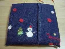 娘の幼稚園の座布団です。実は秋口に縫ったものが大きすぎたようで冬休み中に縫いなおし、ついでにアップリケをいっぱいしました。例によってアップリケパンチャーで雪だるま。裏面はずっと前にカナダに行った時にかわいいーって思って買った動物柄の生地の一部分。いいカナダ土産と思って買ったんですが、made in england って書いてありました。きっとアメリカ、カナダでは子供部屋のインテリアに使うんだろうなぁ。うらやましいなぁ