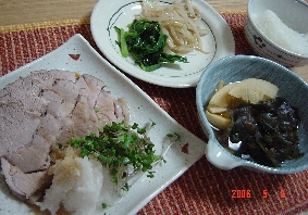昨日とおとといのご飯です。昨日のはヒットでした。中国の緑茶のロンジンをたっぷりティーバッグに入れて豚の肩塊と煮こみました。薄切りにして大根おろしとブロッコリスプラウトを添えてポン酢をかけて食べたらなんともいい感じ・。ちょっとお勧めです。ニラとモヤシのナムル若竹煮とともにところでおとといは普通のジャガイモと牛挽肉のコロッケでしたが昨日のランチのためにうずら卵をどっさり茹でたのでスコッチエッグ風に中に入れたコロッケにしました。手間はかかるけど、子供ウケしますよね。後ろのサラダは黒胡麻入り刺身コンニャクでしたコンニャク好きの娘はペロッと食べてました。