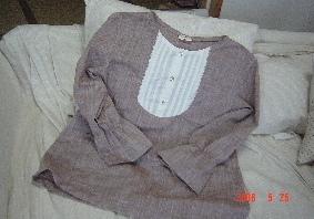 リバティーのコットンクロスってはさみ入れるのになかなか勇気がいります。少し私にとっては高級な布地なので。やっと勇気が出たのでシャツにして見ました。中のキャミは昨日アップしたものです。きれいなペイズリーって思って買ったんだけどシャツにしたら少し年配向き??になっちゃった!!カフスも私にしては頑張って作ったんですが。老けて見えない様ならいっぱい着たいなぁ。