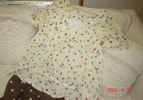 ジャージ系の布地は初心者です。ここのところぼちぼち作っているんですがまだ納得行くものが出来てません。今回も胸元のフリルがちょっと・・・。ベージュぽい色のダイア形の形がほんのり浮き出たジャージ生地の縁の始末をWガーゼのチェリーの柄のバイアスでしました。 昨日は大変でした。娘は2回目の救急車です。娘はマカダミアナッツを食べるとびっくりするほど短時間に反応をして顔中腫れあがっちゃう体質。腫れが気管に出ると呼吸困難になってしまうので怖いんです。でもこれまで他のナッツでは反応が出たことがなかったので昨日も胡桃が少し乗ったパンをもらってあげちゃったら・・・。出てしまったんです。まず口が痛いと言って泣き出し全身がざっとかゆくなり。これは友人といったデパートでの話。以前反応が出た時に次になったら救急車で来るように言われたのでデパートに救急車を呼んでもらっちゃいました。これまでもひどい状態になるまで1時間ちょっとかかってたので食べて30分で救急車を呼んだ時は救急車を呼ぶほどには見えなかったと思い少し周囲の目が気になったけど・でも早い処置で今回は軽症ですみました。いっしょにいた友達はびっくりしただろうなぁ。せっかくの楽しい時間をごめんね。点滴が落ちて病院が出れるようになるまで3時間・・・。つかれた1日でした。