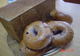 娘に作ったタータンチェックのスモックが個人的にすごく気に入ったのでもう1つ作ってみました。もう1つかわいい柄の布地が合ったので同じ形でもう1つ娘のものを作る時より丁寧にしてタグもつけて・・・・・。オクに出して見ます。こちらよかったら見てみてください!!おそろいのヘアゴムも作ってみました。**********************************今日はフルーツ系のパン巨峰レーズンたっぷりの食パンとブルーベリーたっぷりのベーグル