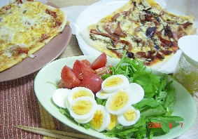 今日は皆さんとピザを作りました。ジャガイモの入りの生地とプレーンの生地オーブン焼きとグリル焼きで具もさまざまなものをみんなでわいわいと作りました。いつもながらみんなでわいわいつくって食べるとおいしいです。*************************************今日の晩ご飯は念願の天ぷらです。天ぷら厳禁令がずっと出てたので(パパより)もう何年も晩ご飯には食べてなかったのですが久々の平日やすみで晩ご飯をいっしょに食べることに出来る今日、お願いして天ぷらにしました。先日アンケートに答えてもらった商品券で少しおごって海鮮のネタも仕入れて来ました。海老、ホタテ、キス、茄子、薩摩芋、みょうが、青じそ蕎麦、豆腐の味噌汁、ほうれん草の胡麻和え。天ぷらがしたかったのにはもう1つ理由があります。卓上IHクッキングヒーターの威力を知りたかったんです。楽天でみつけた卓上IHクッキングヒーター180度に設定したらもう火加減なしで揚げつづけられました。そして薩摩芋の火通りの早さに少しびっくりそしてやっぱり目の前の揚げ立てはおいしかったです。普段油を控えに控えてる胃には少し重かったかな。明日は走らねば・・・。