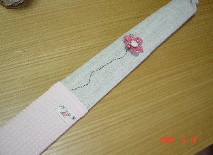 さてこのながーーい巾着は何を入れるものでしょう??長さは60cmほどあるんですよーー。当たった方にはなにもないけど・・・・。ピンクのワッフル地と薄手のリネンの生地にここの所はまってる花のモチーフをつけました。裏はくっきり赤地のチェリー柄******************************************handmadeのものオクに出してます。こちら