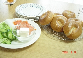 皆さんと一緒にベーグルを作りました。今日もランチは焼き立てのベーグルにスモークサーモンサンド今日はソーセージ、プレーン、ブルーベリーのものを作りました今日のデザートはミルクチョコレートとダブルベリー(カシスとブルーベリー)のムース。