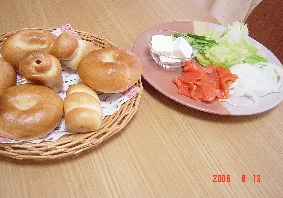 今日は皆さんとベーグルを作りました。プレーン、ブルーベリー、シナモンレーズン、ソーセージ等々プレーンとソーセージしか画像がありませんが。スモークサーモンと、クリームチーズとキュウリ、オニオン、レタスをはさんでデザートはオレンジムース皆でわいわい作ってると楽しくおいしいですね。**********************************ところで昨日は潮干狩りに行ったお土産を戴いたのでスパゲッティ―ボンゴレでした。トマトソースの作り置きでトマトとツナのファルファッレと蒸したチキンのサラダ