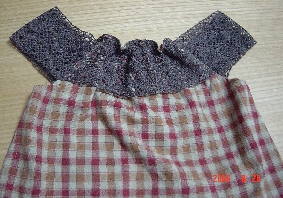 これは昨晩の作品。むらいとって言うんでしょうか。チョコレート色なんだけど、しろっぽい線がいい味を出しているさらっとしたコットンそれにレース地の裾をミシンでサテンステッチにして切って作ったスカラップレースを組み合わせました。いつものタグをはって前後が同じ型なのでタグで前を分かるようにしました。ポケットもつけました。隠れて見えない袋ポケット!!********************************昨日のぞうさん、私が!!お気に入りで娘にとられたくなかったのに、思いっきりとられてしまいました。朝の一言目が“ぞうさんがいない”でした。