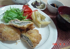 今日は少し話題になってるらしい(正確には知りません)キムカツのミルカツを真似して見ました。いぜんTVで見たことのあるキムカツのお肉は信じられないほどの薄切り肉だったので完全な再現はできないけど。手に入る限りの薄切り肉でやって見ました。2枚ごとくらいに青じそをはさんで。やっぱりジューシーで柔らかくって少し手間だけどやって本当にやってよかったって思っちゃいます。ひじきの煮物ナスの生姜醤油焼きポテトフライ水菜、トマト絹さやの味噌汁